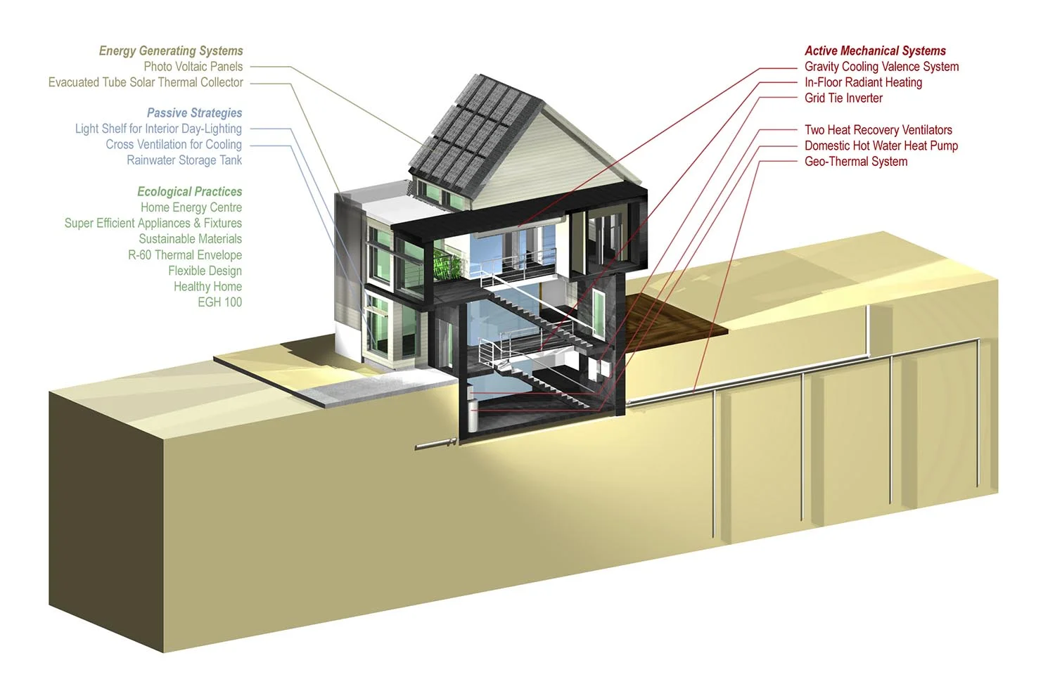 Some features of the home include R-60 walls and roof, geothermal radiant heating, photovoltaic, recycled and reused materials, as well as adaptable interior spaces that reduce the need for physical alterations. Equilibrium Winnipeg is an adaptable, healthy living environment that operates with a low impact on the environment and society.